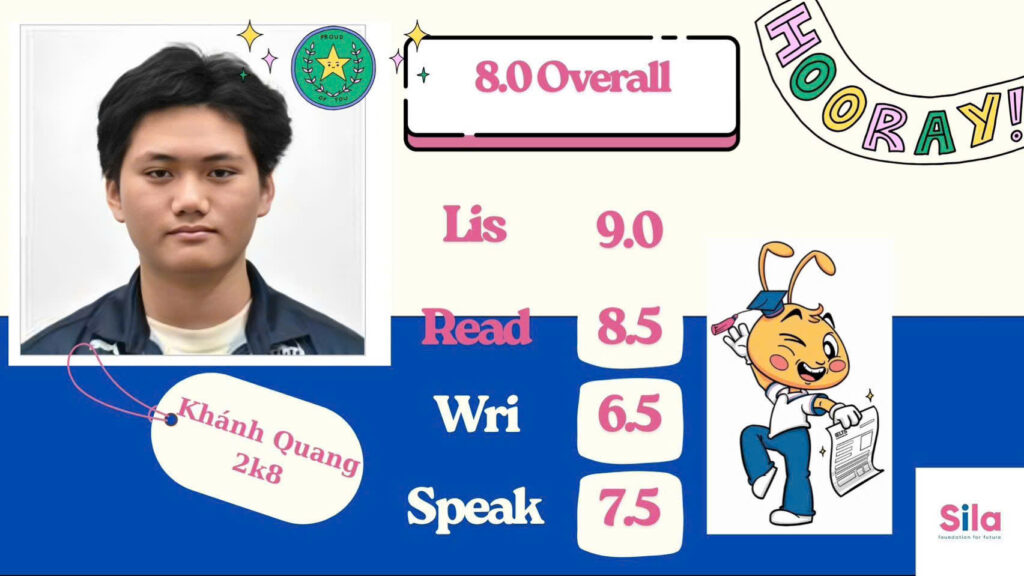 IELTS 8.0 ở tuổi 2k8 — đây là thành tích khiến cả Sila Education tự hào. Khánh Quang không chỉ đạt Overall 8.0 mà còn ghi điểm Listening 9.0 tuyệt đối — một con số hiếm gặp ngay cả với thí sinh quốc tế!