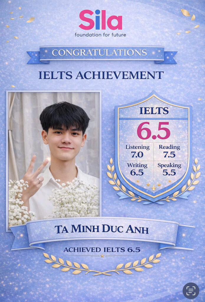 Đức Anh là học viên mà thầy cô Sila hay nhắc đến như một tấm gương về sự kiên trì và thái độ học tập nghiêm túc. Bạn từng thi IELTS lần đầu và chỉ đạt 5.5 — nhưng thay vì nản chí, Đức Anh xác định lại lộ trình và quay lại chinh phục 6.5!