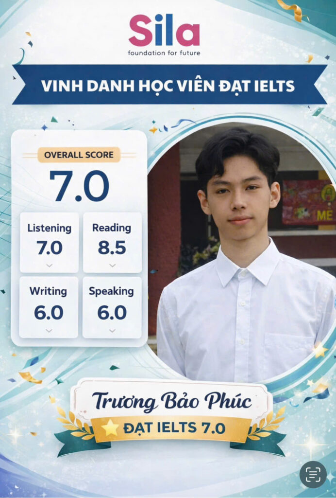 Trong số những học viên xuất sắc của Sila Education, Trương Bảo Phúc nổi bật không chỉ vì điểm số IELTS 7.0 ấn tượng, mà còn vì tư duy học tập cực kỳ có hệ thống của một bạn trẻ 2k.